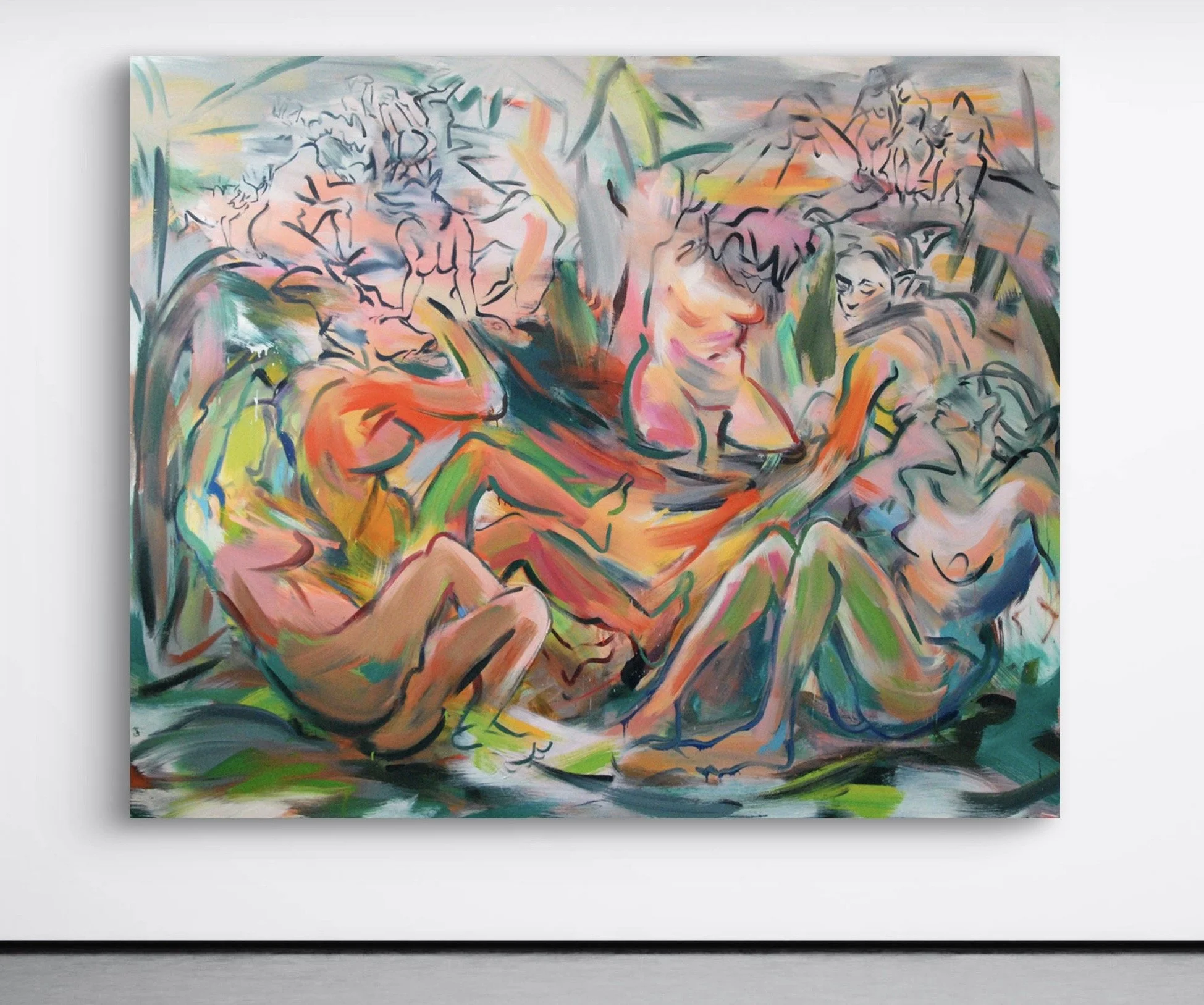 "The Rush, the Trash, and the Flesh," 2024, oil on canvas, 88" x 131"